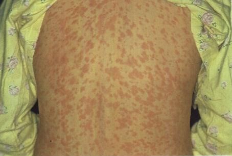 Os principais sintomas são: febre acompanhada de tosse persistente, irritação ocular, coriza, congestão nasal e mal-estar intenso. Após estes sintomas, há o aparecimento de manchas avermelhadas no rosto, que progridem em direção aos pés, com duração mínima de três dias.