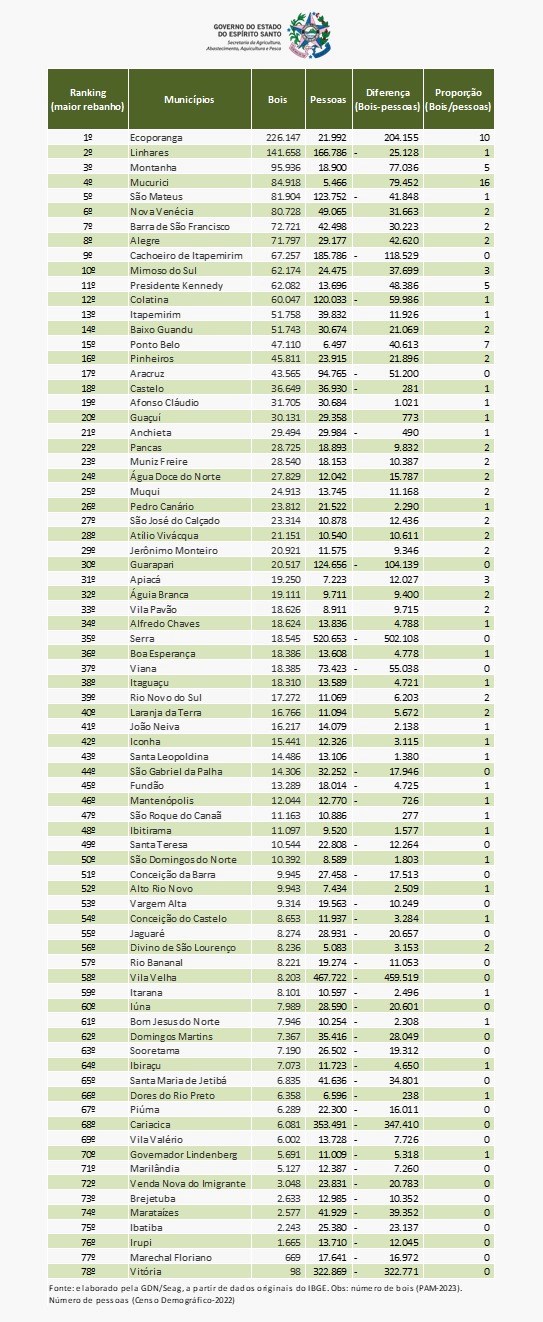 O município com a maior relação “boi por pessoa” é Mucurici, no extremo norte do Estado, onde há 16 bovinos para cada morador. Já Ecoporanga lidera em número absoluto de bovinos, contabilizando mais de 226 mil cabeças de gado para uma população de pouco menos de 22 mil pessoas (uma proporção de 10 bois por habitante). Esses números colocam os municípios como referências na produção pecuária, contribuindo significativamente com o abastecimento de carne e leite em todo o Estado.