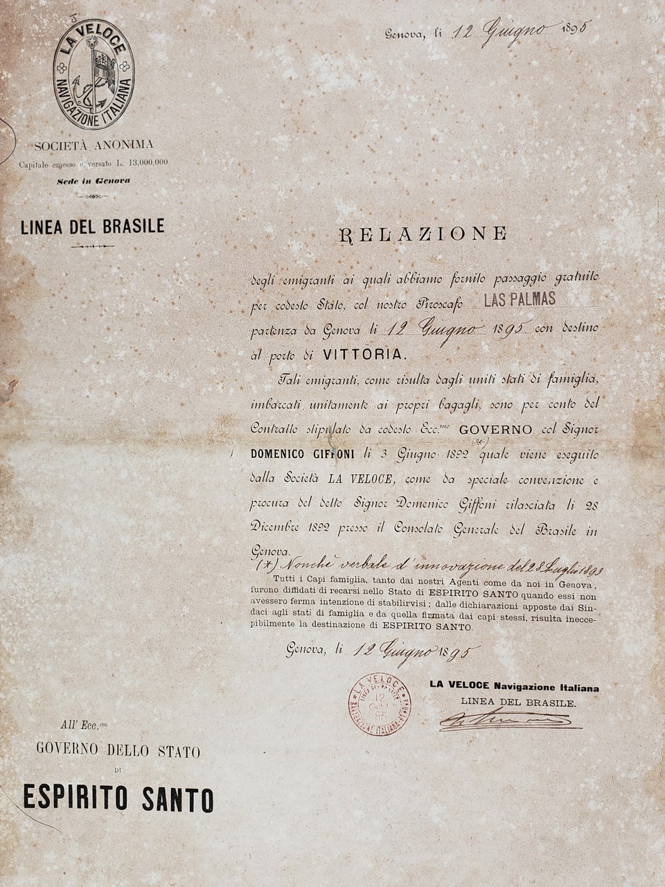 Após um longo período de negociação, o Ministério da Agricultura autorizou a Província capixaba a firmar contrato com Tabacchi, que por sua vez enviou emissários ao Trentino (Tirol Italiano), à época sob o domínio austríaco, para capitanear famílias daquela região e do Vêneto. Assim, no dia 3 de janeiro, às 15 horas, partia do porto de Gênova o “La Sofia”. Ao todo, foram 388 camponeses que embarcaram e chegaram à capital Vitória em busca de novas oportunidades e vivências.