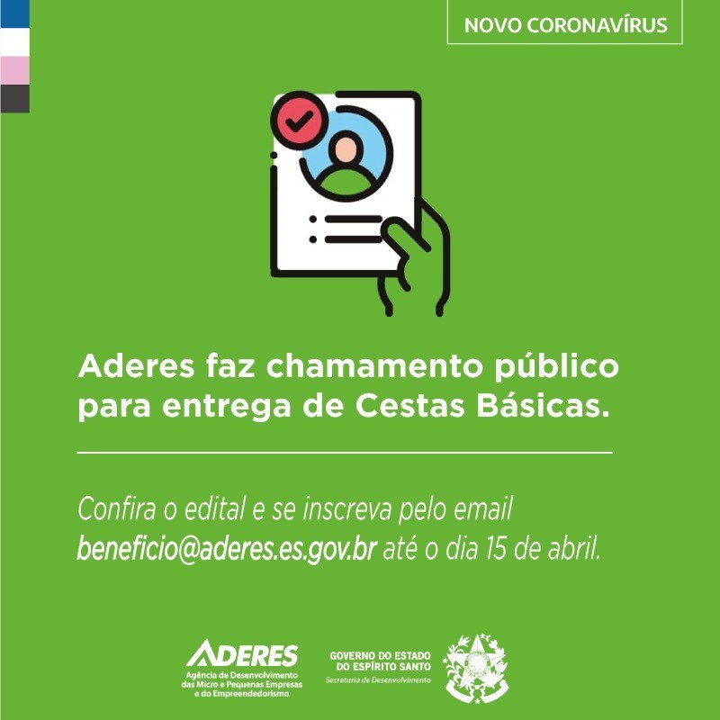 Com a finalidade de aliviar os impactos econômicos provocados pela propagação do novo Coronavírus (Covid-19), no Espírito Santo, a Agência de Desenvolvimento das Micro e Pequenas Empresas e do Empreendedorismo do Estado (Aderes) abre edital de chamada pública de seleção para empreendedores da economia solidária e do artesanato capixaba, interessados em receber uma cesta básica durante a pandemia.