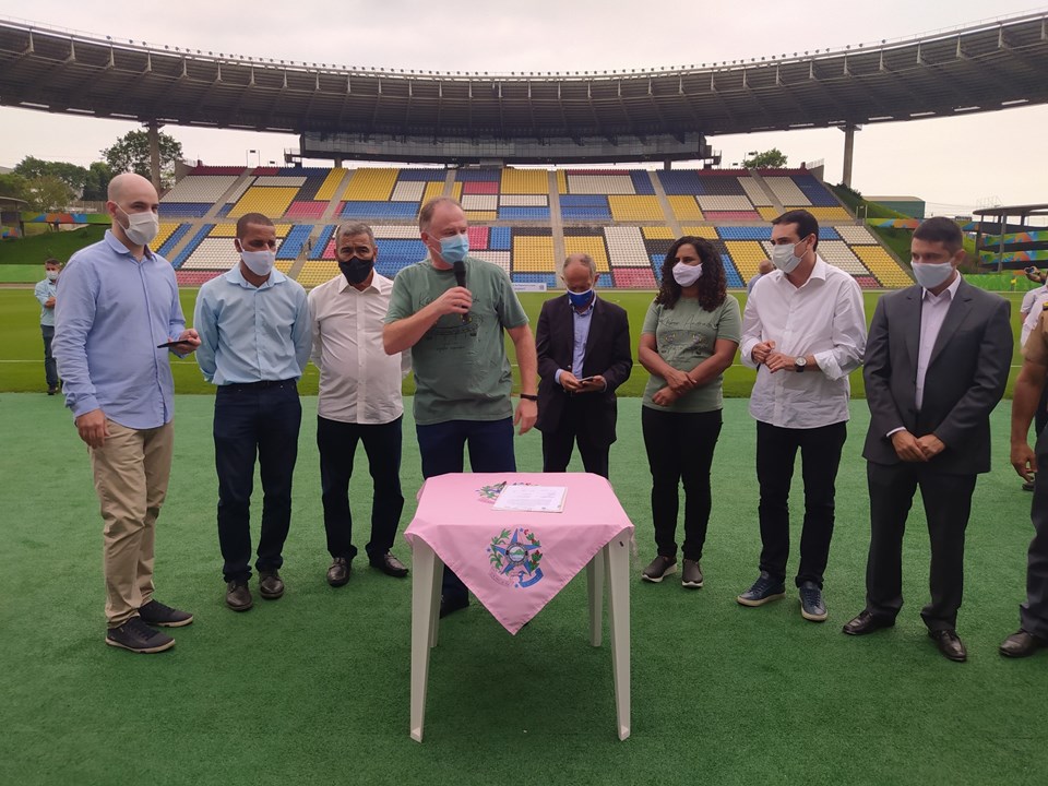 Satisfeito com o avanço das obras no local, o secretário de Estado de Esportes e Lazer, Júnior Abreu, celebrou a presença do secretário-geral da CBF no evento e confirmou que as obras no estádio estão perto de acabar.
