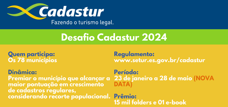 Confira o Regulamento do Desafio Cadastur em: https://setur.es.gov.br/cadastur.