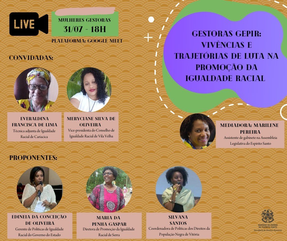 A Secretaria de Direitos Humanos (SEDH), por meio da Gerência de Políticas de Promoção da Igualdade Racial (Gepir), realiza um encontro virtual nesta sexta-feira (31), às 18 horas, encerrando o “Julho das Pretas”, mês em que se celebra o Dia Internacional da Mulher Negra Latino-Americana e Caribenha – 25 de julho. O evento “Gestoras Gepir: Vivências e Trajetórias de Luta na Promoção da Igualdade Racial” vai ocorrer na plataforma Google Meet.