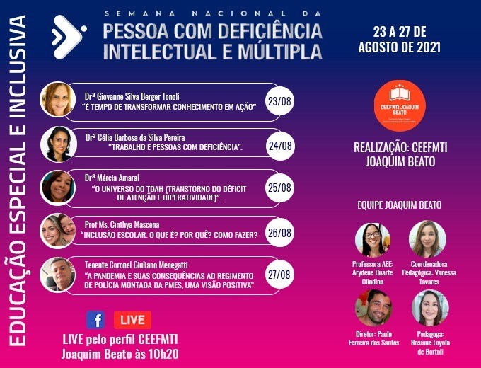 O Centro Estadual de Ensino Fundamental e Médio em Tempo Integral (CEEFMTI) Joaquim Beato, localizado na Serra, promoverá, de 23 a 27 de agosto, a “Semana da Pessoa com Deficiência Intelectual e Múltipla”, com o tema “É hora de transformar conhecimento em ação”.