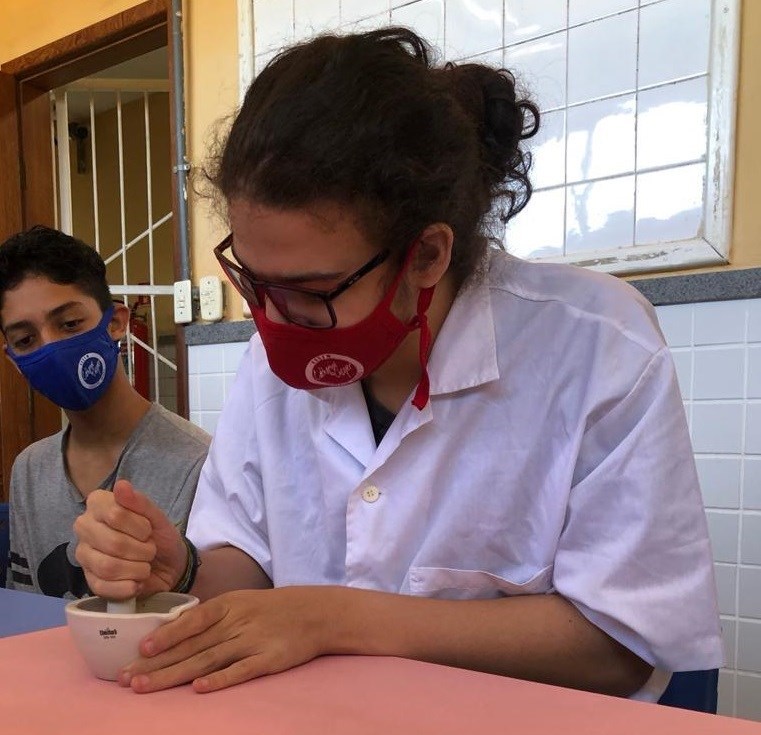 Na última sexta-feira (25), durante aula prática interdisciplinar, a professora de Química Érica Albuquerque realizou com os alunos experimentos sobre extração de componentes químicos polares e apolares, com dois tipos de solventes: álcool (polar) e heptano (apolar). “A espécie utilizada no processo é conhecida popularmente como hortelã-pimenta, um híbrido do cruzamento entre as espécies Mentha aquatica e Mentha spicata”, explicou a docente.