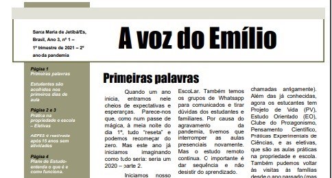 A Escola Estadual de Ensino Fundamental e Médio (EEEFM) Fazenda Emílio Schroeder, de Santa Maria de Jetibá, produz o jornal escolar “A voz do Emílio”. O objetivo da atividade é possibilitar a prática de leitura e escrita, com foco no ensino-aprendizagem de vocabulário, pontuação, gramática, além da compreensão da finalidade e estrutura dos gêneros textuais.