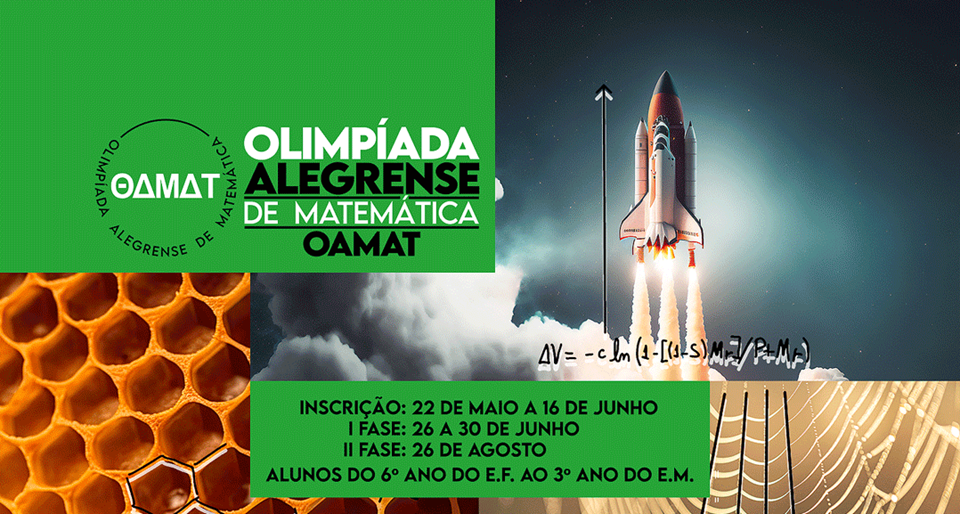 Estão abertas, até o dia 16 de junho, as inscrições para a 1ª Olimpíada Alegrense de Matemática (OAMAT). As inscrições devem ser realizadas pelo diretor(a) ou professor(a) de Matemática indicado pela direção da escola como responsável pela competição. Para inscrever a unidade de ensino, basta preencher o formulário, por meio do link: https://forms.gle/QmL9VsVSXoAAzdSb9.