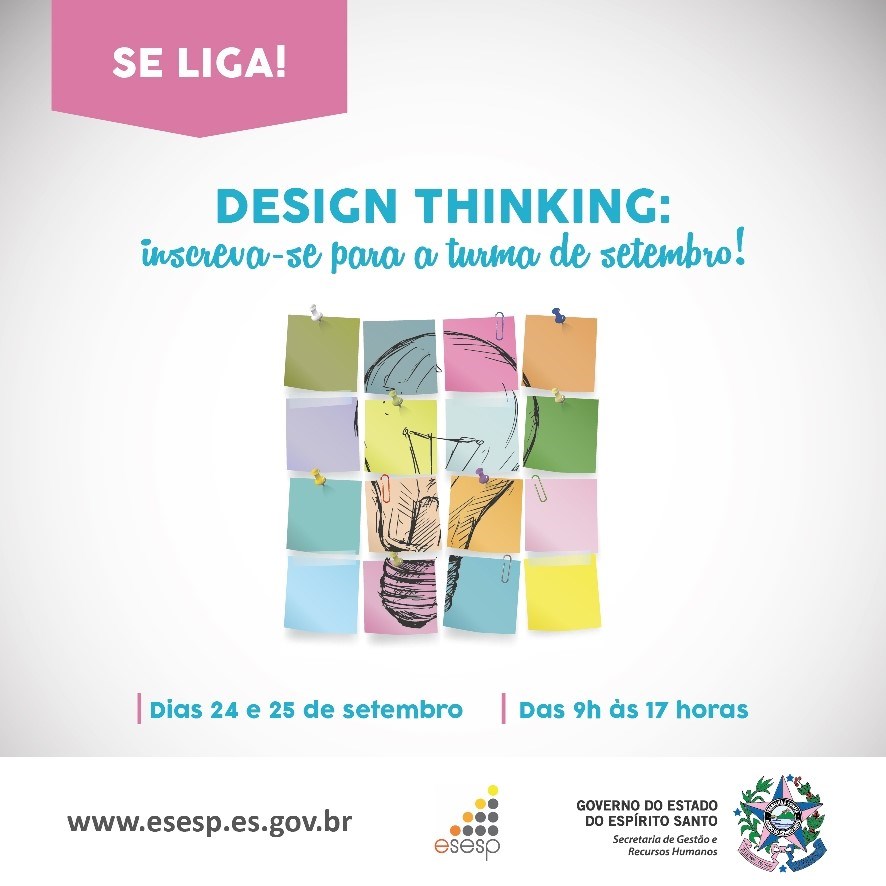 A Escola de Serviço Público do Espírito Santo (Esesp) abriu, para o mês de setembro, uma turma da oficina “Design Thinking”. A capacitação está programada para ocorrer nos dias 24 e 25 de setembro, das 9h às 17h, na sede da instituição, em Vitória. As inscrições começam nesta sexta-feira (13) e seguem até o próximo dia 20.