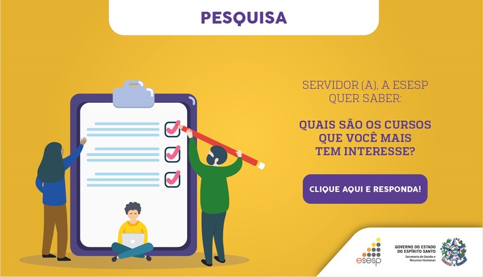 Os servidores públicos capixabas vão poder participar do planejamento da agenda mensal de cursos da Escola de Serviço Público do Espírito santo (Esesp). Nesta segunda-feira (15), a instituição iniciou uma pesquisa para verificar quais são os cursos e demais ofertas que os profissionais no Estado e dos municípios mais necessitam.