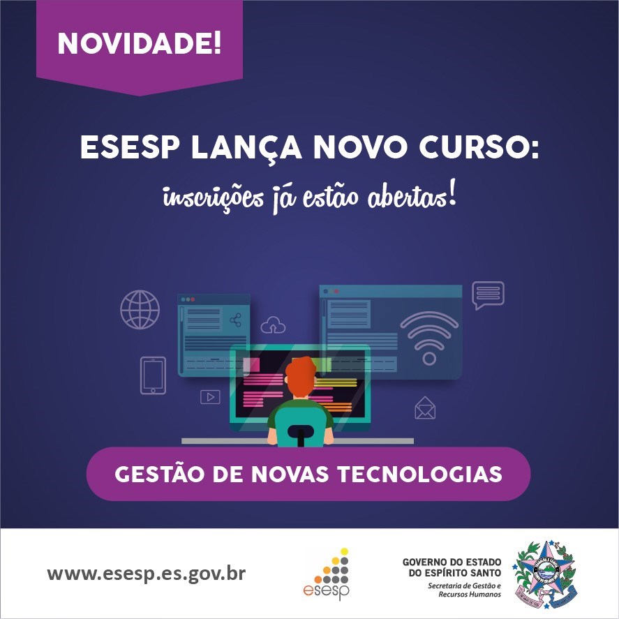 A Escola de Serviço Público do Espírito Santo (Esesp) trouxe mais uma novidade para a capacitação dos servidores estaduais e municipais. Neste mês de agosto, a instituição lança o curso “Gestão de Novas Tecnologias”, que integra o eixo de aprendizagem “Conhecimento em Rede”. O curso para a primeira turma será realizado entre os dias 26 e 30 de agosto, e as inscrições já estão abertas.