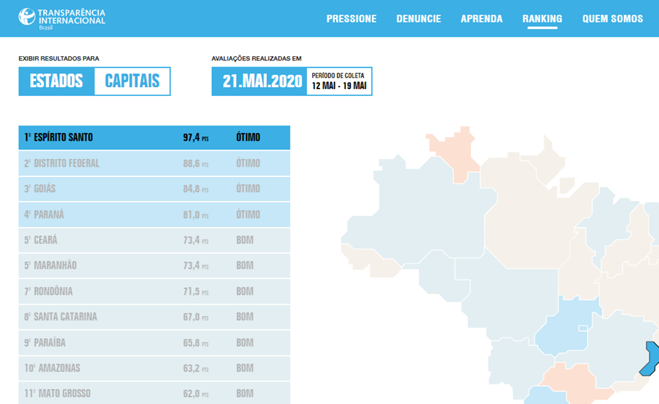 Além disso, a Transparência Internacional analisou o formato de divulgação e a disponibilização de dados abertos, que permitem o download e filtragem das informações. O controle social também foi avaliado: os Estados que divulgam e facilitam o acesso do cidadão à Ouvidoria ganharam pontuação maior.