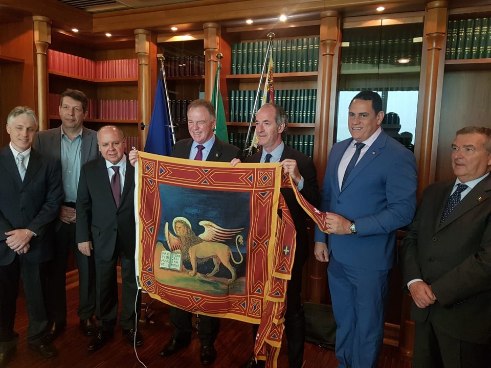 Casagrande ressaltou a importância da parceria entre os Estados, que têm em comum uma gestão fiscal de destaque, estando entre as melhores de seus países. “A região do Vêneto é uma das regiões mais organizadas da Itália com boa gestão fiscal e financeira, o que condiz com a realidade do nosso Estado. Acho muito importante esse termo de cooperação”, afirmou o governador, que recebeu de presente uma bandeira do Vêneto, considerada uma das mais antigas do mundo – com 1100 anos de história.