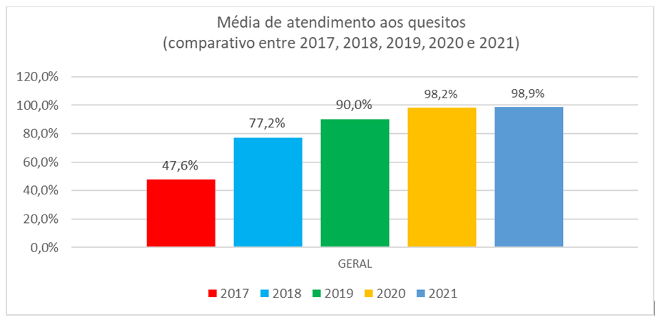 Na avaliação de transparência ativa, a média de atendimento aos quesitos previstos na Lei de Acesso à Informação (LAI) nos sítios institucionais foi de 98,9%, superior a 2020 (98,2%). Desde a primeira análise, realizada em 2017 (quando a média foi de 47,6%), o Estado avançou 50,6% no cumprimento dos quesitos.