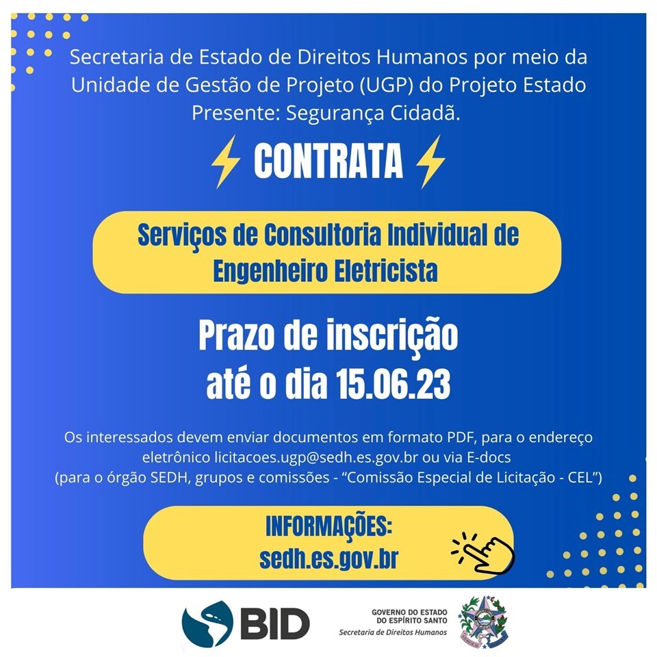 A Secretaria de Direitos Humanos (SEDH), por meio da Unidade de Gestão de Projeto (UGP) do Projeto Estado Presente: Segurança Cidadã, está com processo aberto de contratação para engenheiro eletricista. Os interessados devem enviar documentação até o dia 15 de junho.