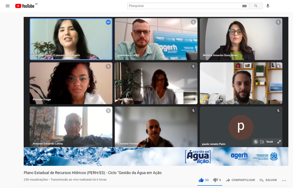 A Agência Estadual de Recursos Hídricos (Agerh) realizou, na manhã desta quinta-feira (17), um webinário sobre o Plano Estadual de Recursos Hídricos do Espírito Santo (PERH/ES), pelo Ciclo “Gestão da Água em Ação”. O terceiro tema da série de encontros virtuais foi debatido ao vivo por especialistas no canal da Agerh no Youtube, onde o conteúdo de cerca de quatro horas já está disponível. Assista aqui.