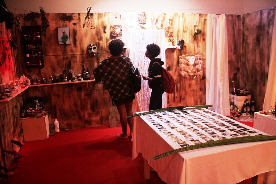 O Quarto de Cura, instalação que já havia sido apresentada ao público em outros dois momentos, reúne obras criadas desde julho de 2018 a partir das investigações da história familiar da artista e registros de suas andanças por esse território temporal e geográfico: são fotografias, textos, mandingas, indumentárias e outros objetos.