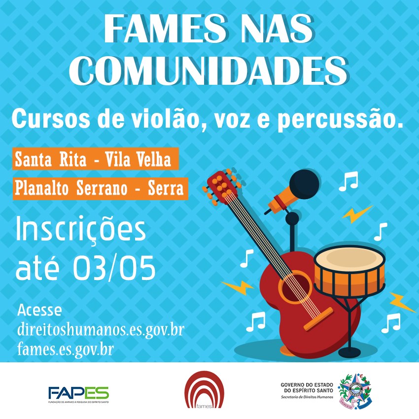 Os bairros de Santa Rita, em Vila Velha, e Planalto Serrano, na Serra, serão os próximos a receber o projeto Fames nas Comunidades. Serão 360 vagas divididas entre os dois bairros, com oficinas de violão, de voz e de percussão. As aulas serão realizadas em três horários, durante o período da manhã, da tarde e da noite.
