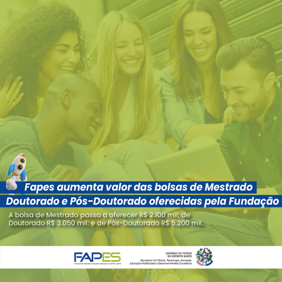 A Fundação de Amparo à Pesquisa e Inovação do Espírito Santo (Fapes) aumentou o valor oferecido nas bolsas de Mestrado, Doutorado e Pós-Doutorado aos capixabas. O Conselho Científico-Administrativo da Fapes (CCAF) aprovou, no início de março, o aumento dos valores em virtude da inflação medida desde o último reajuste (maio de 2020).