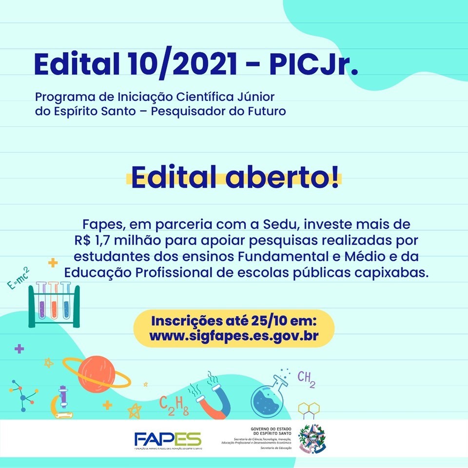 A Fundação de Amparo à Pesquisa e Inovação do Espírito Santo (Fapes), em parceria com a Secretaria da Educação (Sedu), abriu, nessa segunda-feira (27), as inscrições para a chamada pública do Programa de Iniciação Científica Júnior – Pesquisador do Futuro (PIC Jr. 2021). As propostas de projetos a serem desenvolvidos por alunos e professores de escolas públicas, em parceria com pesquisadores ou instituições de Ensino Superior localizadas em bairros atendidos pelo Programa Estado Presente em Defesa da Vida, do Governo do Estado, poderão ser apresentadas até o dia 25 de outubro.