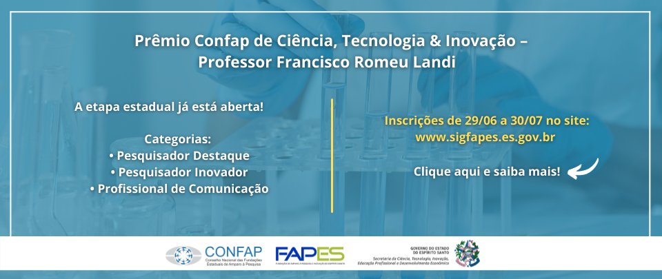 A Fundação de Amparo à Pesquisa e Inovação do Espírito Santo (Fapes) abriu, nesta terça-feira (29), chamada pública Estadual para premiar pesquisadores e profissionais da comunicação e, posteriormente, para participarem da etapa nacional do prêmio do Conselho Nacional das Fundações Estaduais de Amparo à Pesquisa (Confap) de Ciência, Tecnologia e Inovação. A premiação, em homenagem ao professor e pesquisador Francisco Romeu Landi, faz parte das comemorações dos 15 anos do Confap.