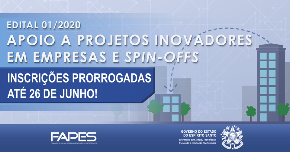 A Fundação de Amparo à Pesquisa e Inovação do Espírito Santo (Fapes) prorrogou o prazo das inscrições do Edital 01/2020 - Apoio a Projetos Inovadores e Spin Off para 26 de junho. As empresas sediadas em território capixaba terão a oportunidade de desenvolver produtos ou processos inovadores com apoio da chamada pública lançada com recursos financeiros que chegam a R$ 10,2 milhões