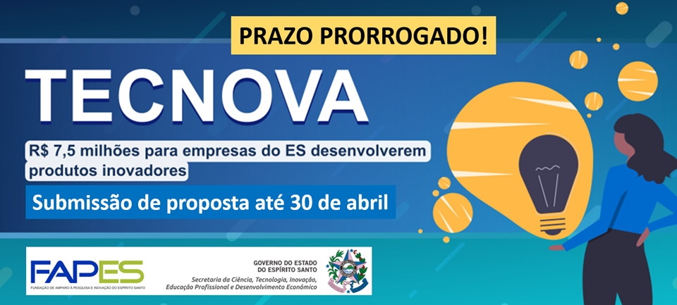 As empresas sediadas em território capixaba terão mais tempo para apresentar suas propostas de projetos de desenvolvimento de produtos ou processos inovadores, com o apoio da chamada pública lançada pela Fundação de Amparo à Pesquisa e Inovação do Espírito Santo (Fapes). O prazo limite programado para 31 de março foi prorrogado até 30 de abril. O edital é referente à segunda edição do Programa de Apoio à Inovação Tecnológica, o Tecnova II, que estipula recursos financeiros de R$ 7,5 milhões no total.