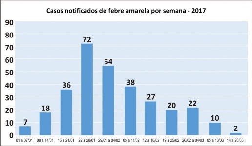 Este ano, até segunda-feira (20), a Sesa recebeu 309 notificações de suspeita de febre amarela. Sessenta e duas notificações foram descartadas. Do total de 247 casos, 105 foram confirmados para febre amarela silvestre, sendo que 32 casos evoluíram para óbito – Muniz Freire (05), Brejetuba (04), Colatina (03), Irupi (03), Ibatiba (02), Itarana (02), Laranja da Terra (02), Pancas (02), Afonso Cláudio (02), Conceição do Castelo (02), São Roque do Canaã (01), Domingos Martins (01), Santa Maria de Jetibá (01), Vargem Alta (01) e Aracruz (01).