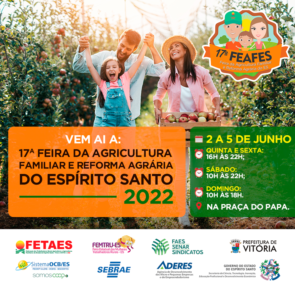 A 17ª Feira da Agricultura Familiar e Reforma Agrária do Espírito Santo (Feafes), é organizada pela Federação dos Trabalhadores Rurais e Agricultores e Agricultoras Familiares do Estado do Espírito Santo (FETAES), e conta com apoio do Serviço Brasileiro de Apoio às Micro e Pequenas Empresas (Sebrae), e Agência de Desenvolvimento de Micro e Pequenas Empresas do Espírito Santo (Aderes).