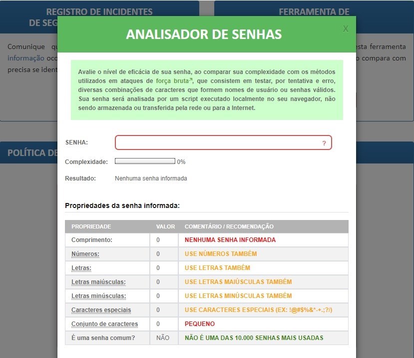 Para conhecer a solução desenvolvida, basta acessar a página do tópico “Segurança da Informação” no site do Instituto. Depois disso, é necessário escolher a opção “Avalie suas senhas agora!”.