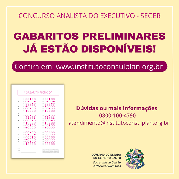 Já estão disponíveis para consulta nos sites www.institutoconsulplan.org.br e www.seger.es.gov.br, os gabaritos oficiais preliminares das provas objetivas de múltipla escolha do concurso para o cargo de Analista do Executivo, da Secretaria de Gestão e Recursos Humanos (Seger), em suas diferentes áreas de formação.