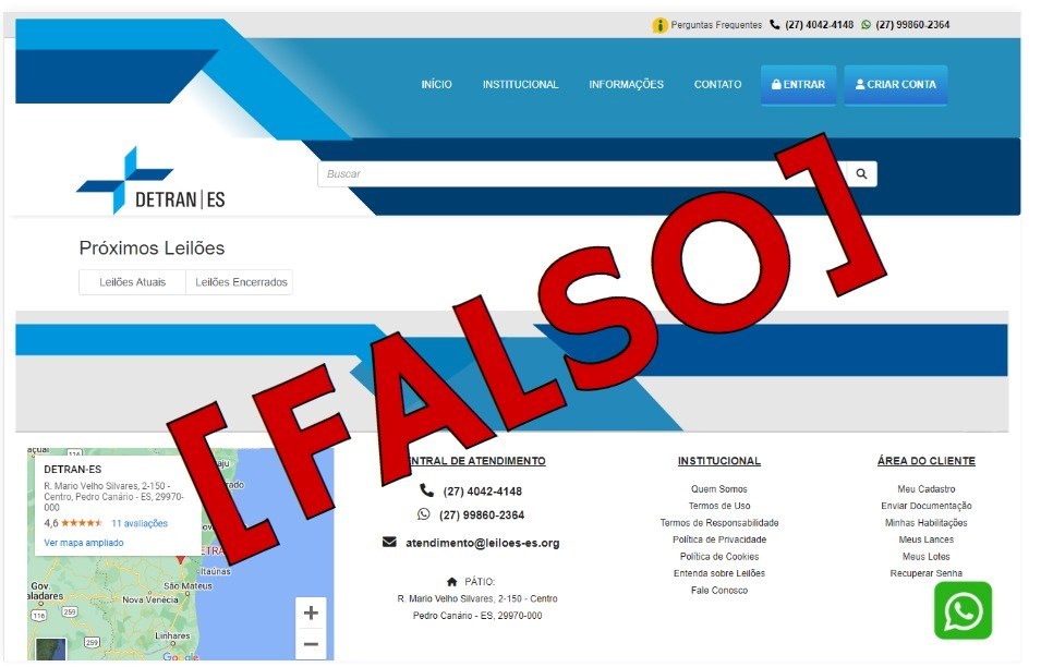 O Departamento Estadual de Trânsito do Espírito Santo (Detran|ES) chama atenção da população mais uma vez para golpes que estão sendo praticados na internet utilizando o nome do Órgão. Nesta quarta-feira (25), chegou ao conhecimento da instituição, por meio da Ouvidoria, sobre a existência de um site falso de Leilão com o link https://detran.leiloes-es.org/home/, que divulga o certame para o dia 23 de outubro.
