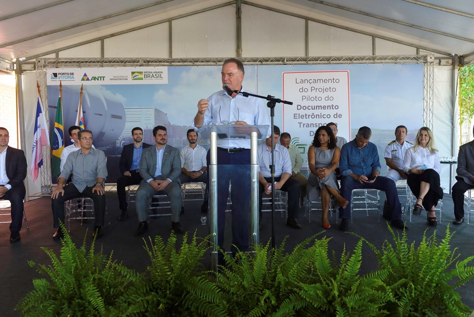 O governador do Estado, Renato Casagrande, participou, na manhã desta segunda-feira (27), do lançamento do projeto piloto do Documento Eletrônico de Transporte (DT-e), no Porto de Capuaba, em Vila Velha. A solenidade teve a participação do ministro da Infraestrutura, Tarcísio Gomes de Freitas, além de outras autoridades estaduais. A nova tecnologia, que será implantada em fase de testes pelos próximos meses, permitirá a unificação de cerca de 20 documentos que são exigidos para operações de transporte de carga no País.