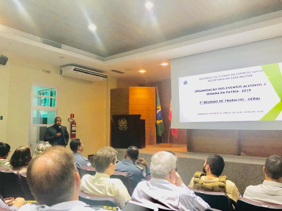 O Governo do Estado, através da Secretaria da Casa Militar (SCM), realizou uma reunião de organização com representantes de vários órgãos e entidades para o Desfile Cívico-Militar, realizado nas comemorações da Independência do Brasil. A atividade, no 7 de setembro, faz parte da Semana da Pátria no Espírito Santo. A reunião foi realizada nesta segunda-feira (02), no Palácio da Fonte Grande, pelo secretário-chefe da Casa Militar, coronel Jocarly Martins de Aguiar Júnior.
