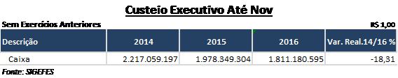 E para a manutenção desse equilíbrio, desde o início da atual gestão, o Governo vem aplicando medidas que já resultaram em expressiva economia de gastos. No comparativo entre novembro de 2014 com o mesmo mês de 2016, as despesas de custeio do Executivo caíram, em termos reais, (-) 18,31%, representando uma economia de R$ 450 milhões, em dois anos. Somente em 2016, a economia foi de R$ 180 milhões.