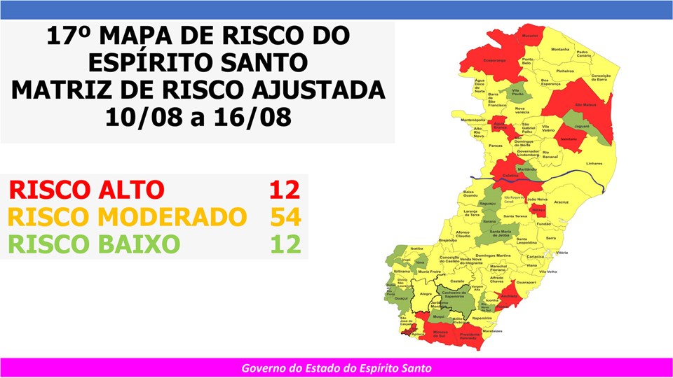 O Governo do Estado anunciou, nesta sexta (07), o 17º Mapa de Risco Covid-19, que terá vigência entre a próxima segunda-feira (10) e o domingo (16). Ao todo, 12 municípios capixabas estão classificados em Risco Baixo, outros 54 estão em Risco Moderado e 12 em Risco Alto.