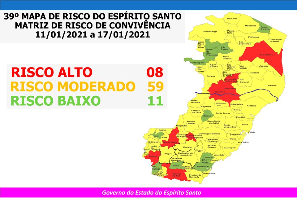 O Governo do Estado anunciou, nesta sexta-feira (8), o 39º Mapa de Risco Covid-19, que terá vigência entre a próxima segunda-feira (11) e o domingo (17). Dos 78 municípios capixabas, 11 estão classificados em Risco Baixo e 59 estão em Risco Moderado. Oito municípios (Colatina, Governador Lindenberg, Guaçuí, Marilândia, Mimoso do Sul, Muniz Freire, São Mateus e Venda Nova do Imigrante) estão classificados como Risco Alto.