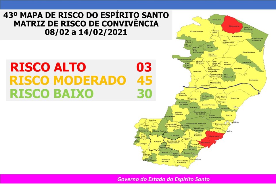 O Governo do Estado anunciou, nesta sexta-feira (05), o 43º Mapa de Risco Covid-19, que terá vigência entre a próxima segunda-feira (08) e o domingo (14). Dos 78 municípios capixabas, 30 estão classificados em Risco Baixo e 45 estão em Risco Moderado. Somente três municípios (Anchieta, Guarapari e Montanha) estão classificados como Risco Alto.