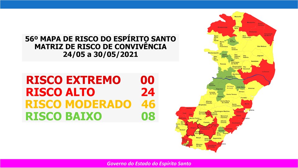 O Governo do Estado anunciou, nesta sexta-feira (21), o 56º Mapa de Risco Covid-19, que terá vigência desta segunda-feira (24) até o próximo domingo (30). Dos 78 municípios capixabas, oito estão classificados em Risco Baixo, 46 em Risco Moderado e outros 24 em Risco Alto.