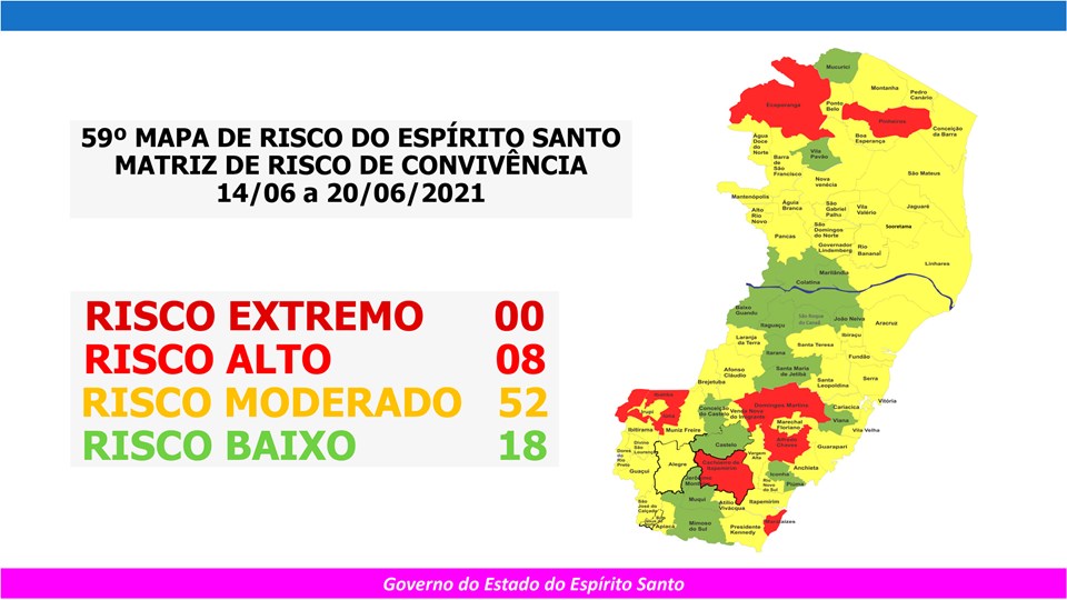 O Governo do Estado anunciou, nesta sexta-feira (11), o 59º Mapa de Risco Covid-19, que terá vigência desta segunda-feira (14) até o próximo domingo (20). Dos 78 municípios capixabas, 18 estão classificados em Risco Baixo, 52 em Risco Moderado e oito em Risco Alto.