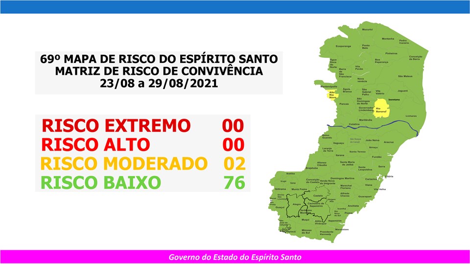 O Governo do Estado anunciou, nesta sexta-feira (20), o 69º Mapa de Risco Covid-19, que terá vigência desta segunda-feira (23) até o próximo domingo (29). Dos 78 municípios capixabas, 76 estão classificados em Risco Baixo e apenas dois (Alto Rio Novo e Rio Bananal) em Risco Moderado.