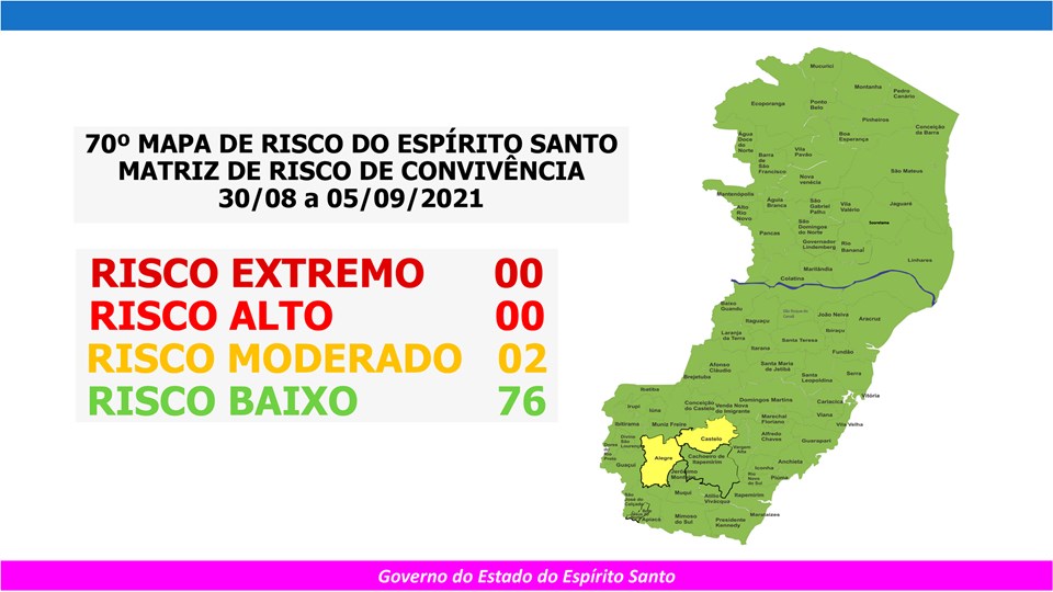 O Governo do Estado anunciou, nesta sexta-feira (27), o 70º Mapa de Risco Covid-19, que terá vigência desta segunda-feira (30) até o próximo domingo (05). Dos 78 municípios capixabas, 76 estão classificados em Risco Baixo e apenas dois (Alegre e Castelo) em Risco Moderado.