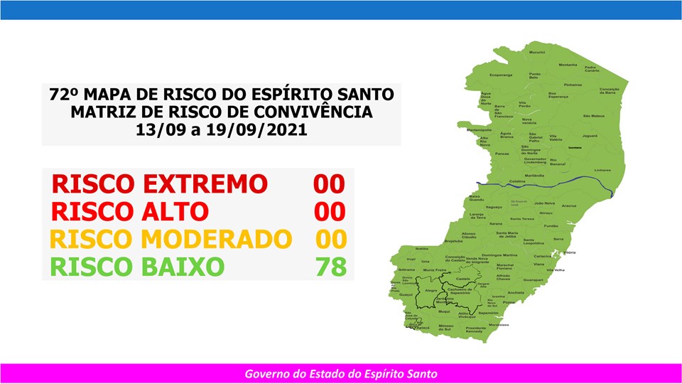 O Governo do Estado anunciou, nesta sexta-feira (10), o 72º Mapa de Risco Covid-19, que terá vigência desta segunda-feira (13) até o próximo domingo (19). Todos os 78 municípios capixabas estão classificados em Risco Baixo. É a primeira vez que isso ocorre desde que foi instituída a estratégia de mapeamento de risco no Espírito Santo, em abril do ano passado.