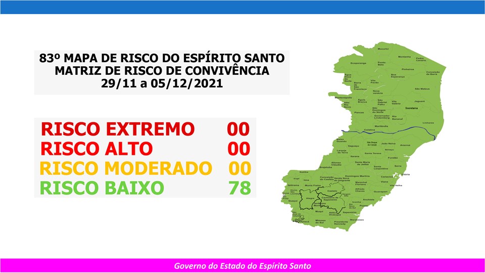 O Governo do Estado anunciou, nesta sexta-feira (26), o 83º Mapa de Risco Covid-19, que terá vigência desta segunda-feira (29) até o próximo domingo (05). Todos os 78 municípios capixabas estão classificados em Risco Baixo. Não há mais municípios em Risco Moderado ou Alto. Até o momento, nenhuma microrregião conseguiu atingir os três índices para a classificação de Risco Muito Baixo.