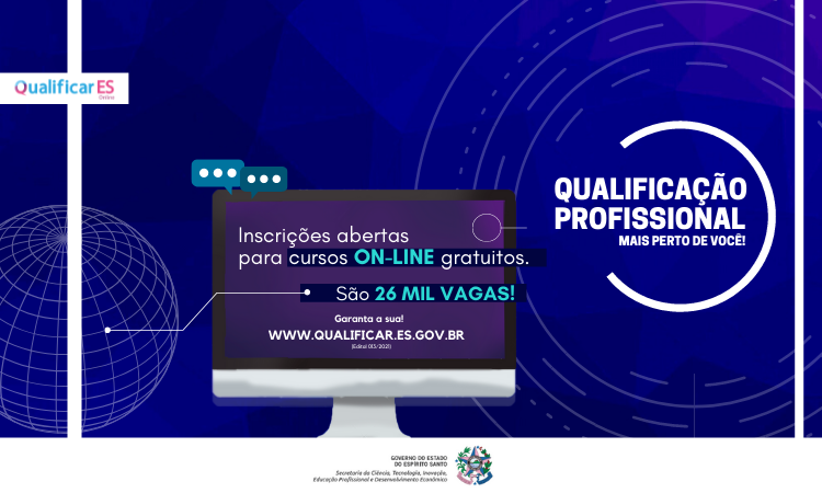 O Governo do Espírito Santo abriu, nesta terça-feira (03), as inscrições para 26 mil vagas de qualificação profissional. Os cursos, que fazem parte do programa Qualificar ES, são on-line e destinados a moradores de todo o Estado. Uma novidade do edital é o lançamento dos cursos de Assistente de Recursos Humanos e Elaboração de Projetos On-line.