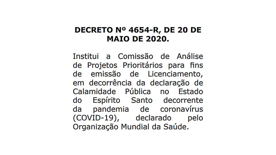 O Governo do Estado do Espírito Santo criou a “Comissão de Análise de Projetos Prioritários de Licenciamento Ambiental” para declarar como prioritários os projetos de incentivo e estímulo ao desenvolvimento econômico. A Comissão será temporária e funcionará até 31 de dezembro de 2021. O decreto Nº 4.654-R foi publicado, nesta quinta-feira (21), no Diário Oficial do Estado.
