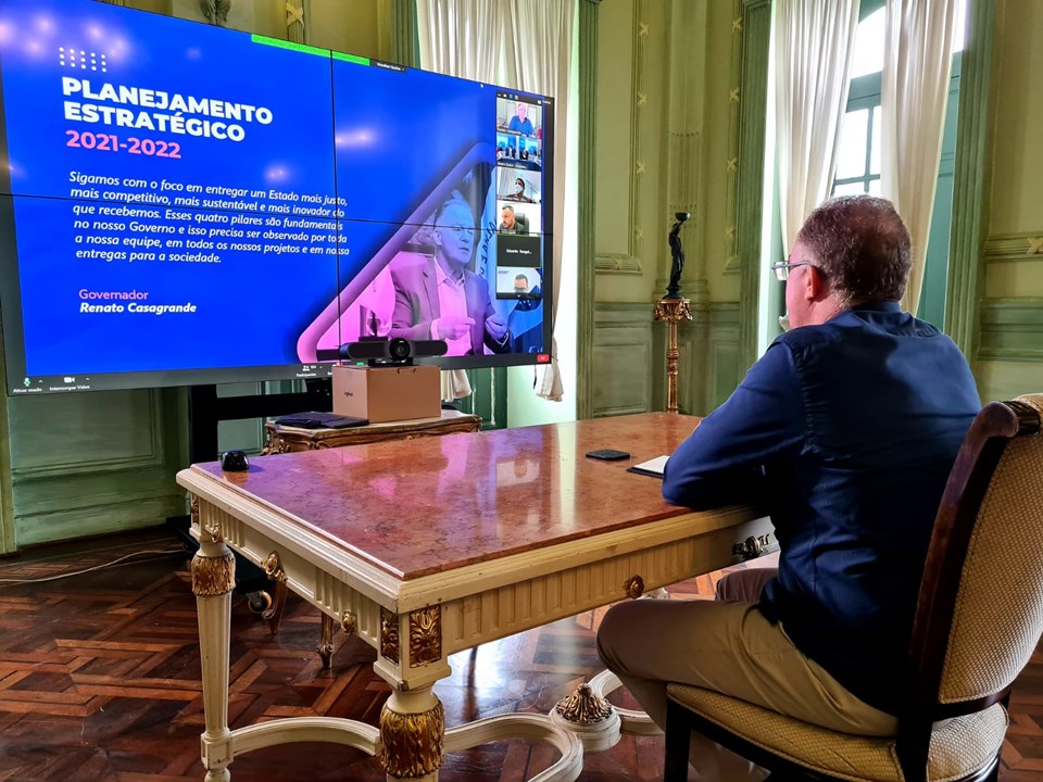 O Seminário de Planejamento Estratégico do Governo do Espírito Santo foi aberto nesta segunda-feira (19), com a participação do governador do Estado, Renato Casagrande; da vice-governadora Jacqueline Moraes; secretários, subsecretários e dirigentes de órgãos do Estado. Durante quatro dias a equipe do Governo participará de reuniões para validação de indicadores, metas e dos projetos da carteira estratégica da Administração Estadual para o período 2021-2022.