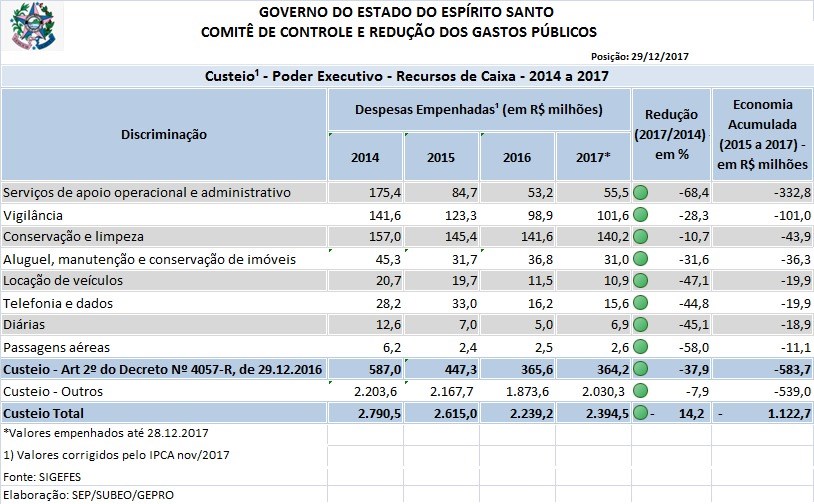 Na comparação de 2017 com 2014, a principal redução de gastos foi nas seguintes áreas: serviço de apoio operacional (-68,37%), passagens aéreas (-58%), locação de veículos (-47%), seguido de telefonia e dados (-44,81%). O custo com aluguel, manutenção e conservação de imóveis também obteve uma economia expressiva, resultando numa redução de gastos de -44,71%.