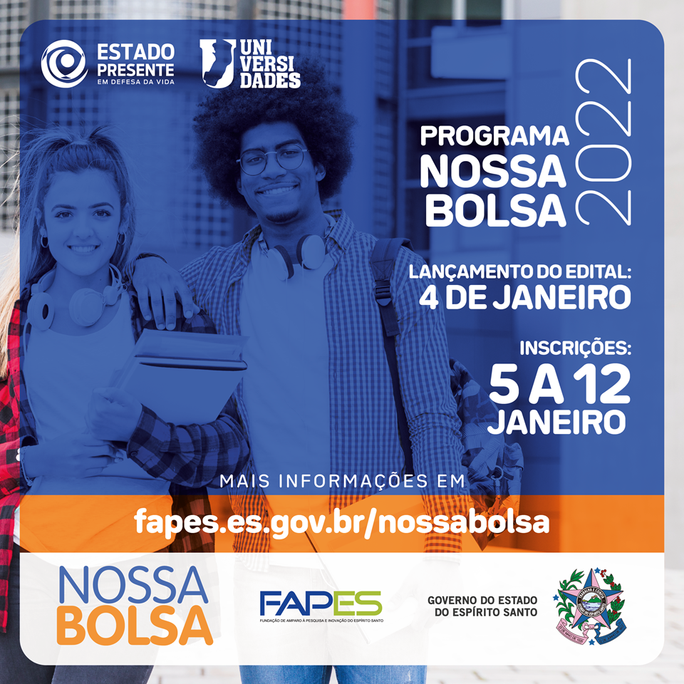 O novo ano começou com boas notícias para quem sonha em fazer a graduação. O Governo do Estado, por meio da Fundação de Amparo à Pesquisa e Inovação do Espírito Santo (Fapes), lançou, nesta terça-feira (04), o edital do Programa Nossa Bolsa 2022, com 1.309 bolsas integrais para graduação. O edital é uma parceria da Fundação com a Secretaria da Educação (Sedu) e investe mais de R$ 68 milhões.