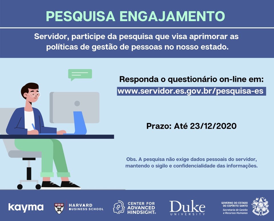 Para participar da pesquisa, os servidores devem acessar o link www.servidor.es.gov.br/pesquisa-es e responder o questionário on-line.