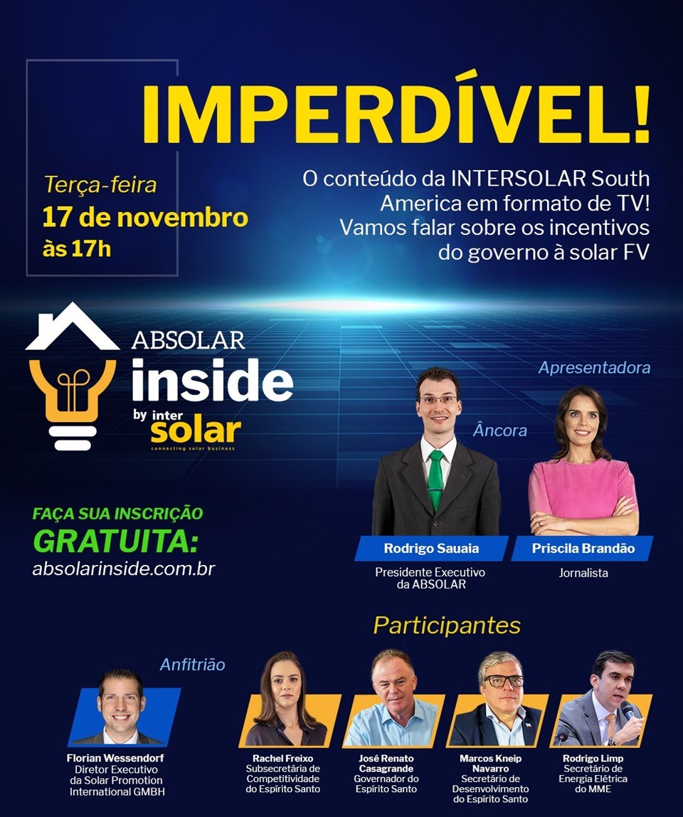 O governador do Estado, Renato Casagrande, fará uma participação especial, nesta terça-feira (17), às 17 horas, no segundo episódio do Absolar Inside by Intersolar. O evento, promovido pela Associação Brasileira de Energia Solar Fotovoltaica (Absolar) e pela Intersolar South America, terá como tema principal as iniciativas governamentais de incentivo à energia solar fotovoltaica nos níveis Federal, Estadual e municipal.